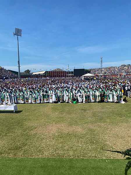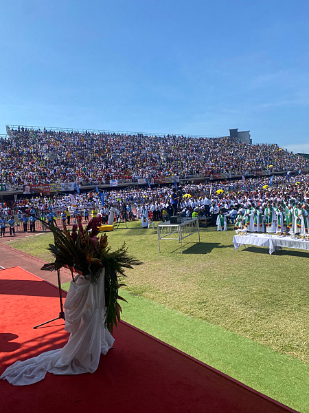 The third and fourth photos offer a wider view, capturing the immense congregation gathered to celebrate the occasion. Numerous priests, alongside thousands of faithful attendees, filled the stadium, creating a vibrant and unified scene of worship. The sheer number of people present reflected the deep-rooted faith in Papua New Guinea and the sense of joy that permeated the event.