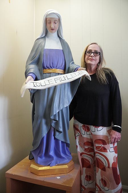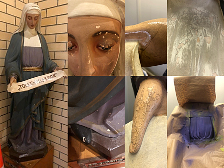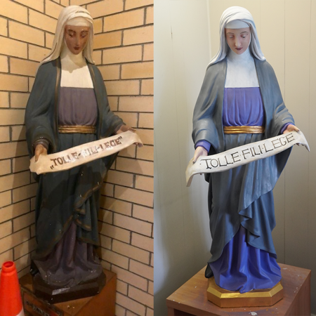 The restoration process involved reinforcing the statue with steel inside and applying layers of plaster to repair the damaged areas. The colour scheme was also updated with great sensitivity to the original design and the expectations of the parish community. “She was very dark before, so I wanted to lighten her up while keeping the same family of colours,” Kathy said. “I didn’t want to change her too much, just to bring her colours up so they’re more reflective.”