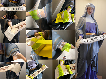 Kathy shared insights into the state of the statue when she first received it. “The statue had a lot of splitting and flaking paint, with several chipped areas,” she explained. “There was also major cracking on the hands, particularly around the pendant she’s holding, which had chunks missing on both sides. These areas needed to be rebuilt.”
