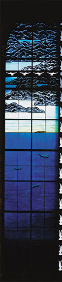 Whales and dolphins frolic in a procession across the window. In a joyful freeing way, they represent God’s presence – as angels would have done in more traditional religious windows. They hint that they are the intelligent ones who do not go to war.