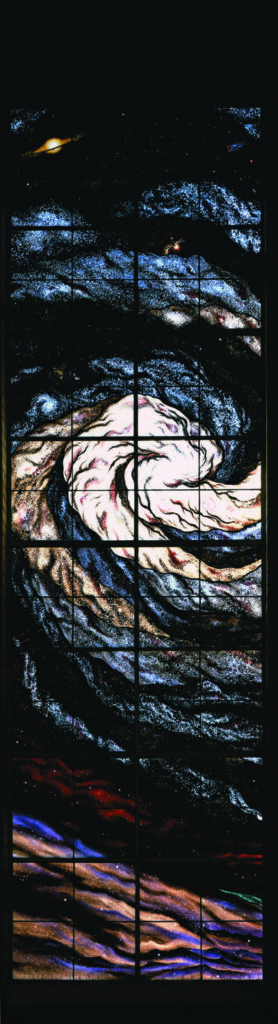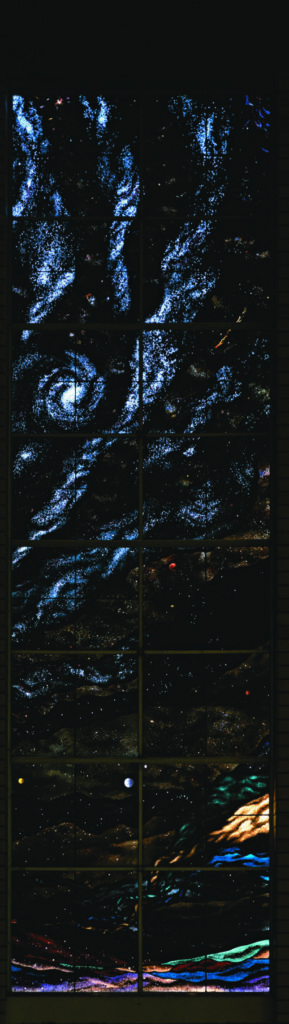 Space, providing the dominant themes for the first six windows, ends in this window and the next. The bright newly-born
