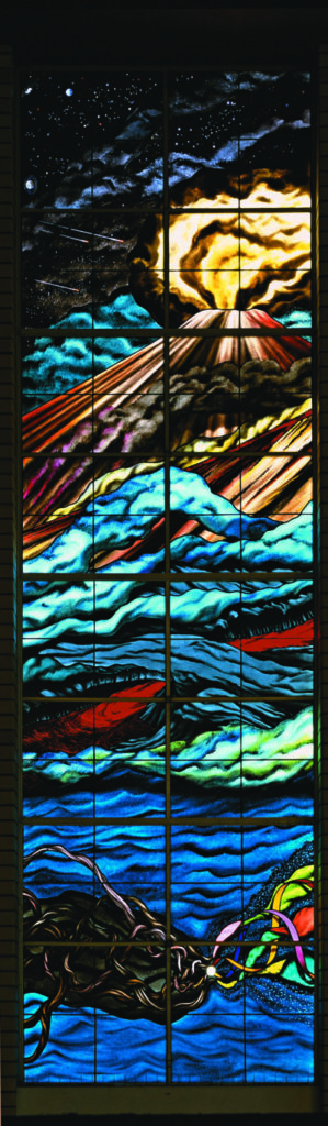 Here in window 9 another volcano explodes. Its red rivers of fire flow across the windows and consolidate the land